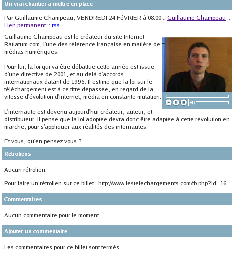 Le débat sur ce site web est donc illusoire, comme je viens de le dire, impossible de suivre une conversation. Ce qui est amusant c'est que, même si il y beaucoup de commentaires, ils sont presque tous du même avis ! Et généralement, ça n'est pas dans le sens du texte (dadvsi) actuel. En particulier, j'ai l'impression que les problèmes liés aux DRM, l'utilisation des fichiers et l'interopérabilité sont aux coeur des préocupations des gens. A part les artistes, personne ne pense que téléchargement == gratuit (je n'ai pas dit que j'étais pour la licence globale).